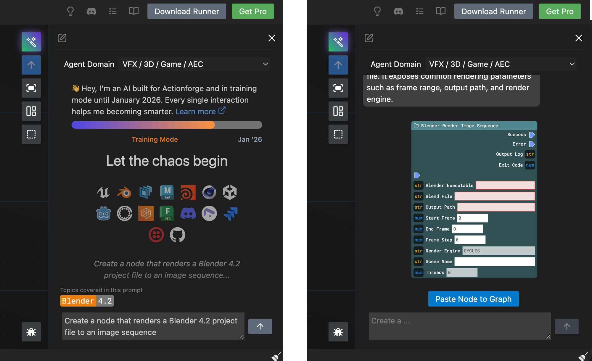 The AI Assistant generates custom nodes for your visual CI/CD pipelines. Specialized in CG workflows for Blender, Cinema 4D, Unreal Engine, Houdini, Maya, and the entire VFX/game development toolchain.